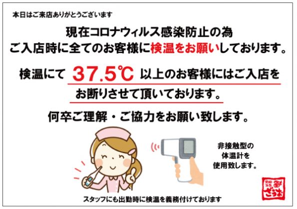 ◆スタッフは出勤時に検温し、37.5℃を超える者は勤務をしないように致します