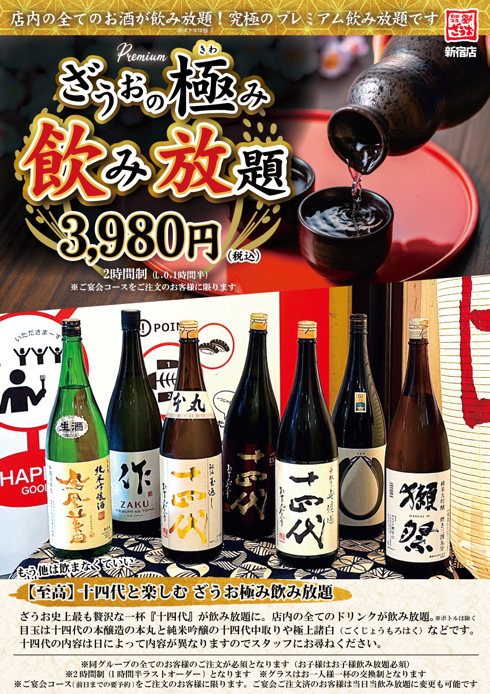 なんと中々市場では手に入らない日本酒・十四代を含めた店内全てのドリンクが飲み放題になる