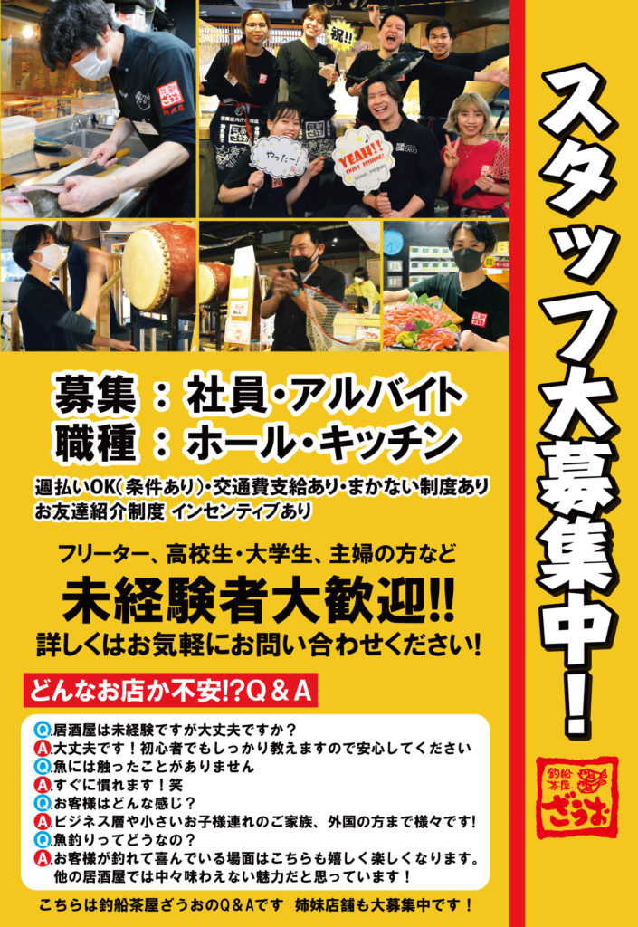 釣船茶屋ざうお及び姉妹店では、一緒に働くスタッフを大募集しております!!
